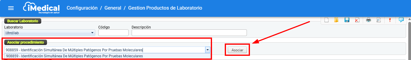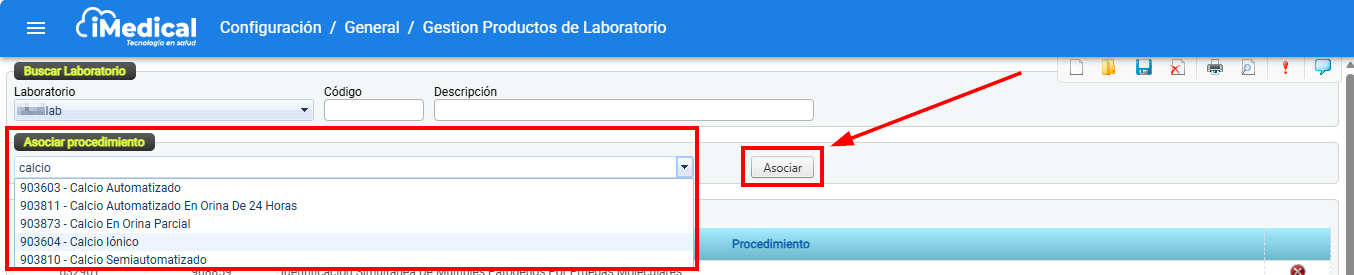 Sección y Campo Asociar procedimiento: Permite vincular nuevos procedimientos al laboratorio seleccionado.