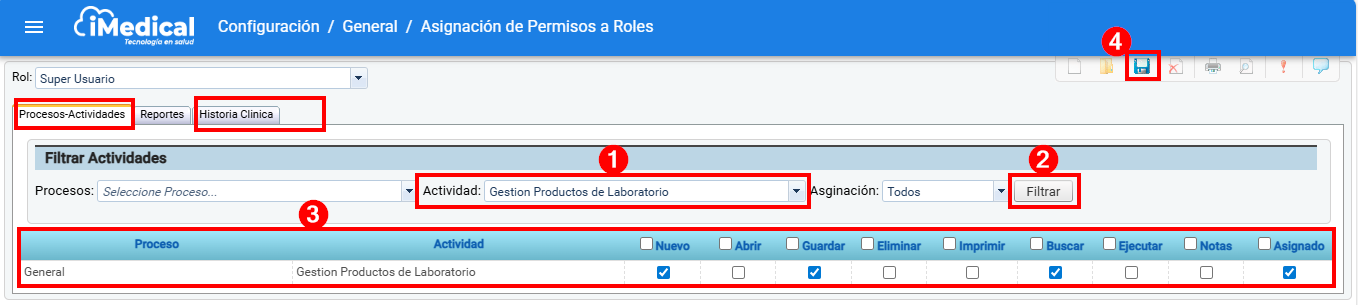 Luego en la pestaña "Procesos-Actividades", Sección "Filtrar Actividades", Campo "Actividad", se debe seleccionar la actividad "Gestión Productos de Laboratorio" y dar clic en el botón "Filtrar" . Posteriormente asigne los permisos y finalmente, de clic en el ícono "Guardar".