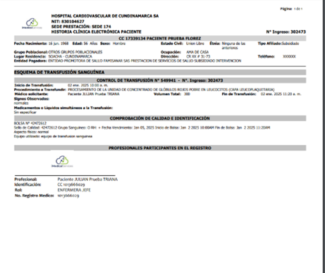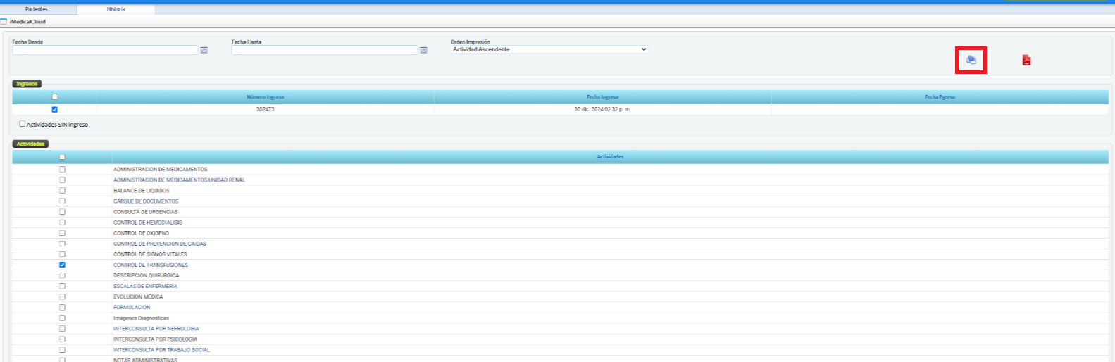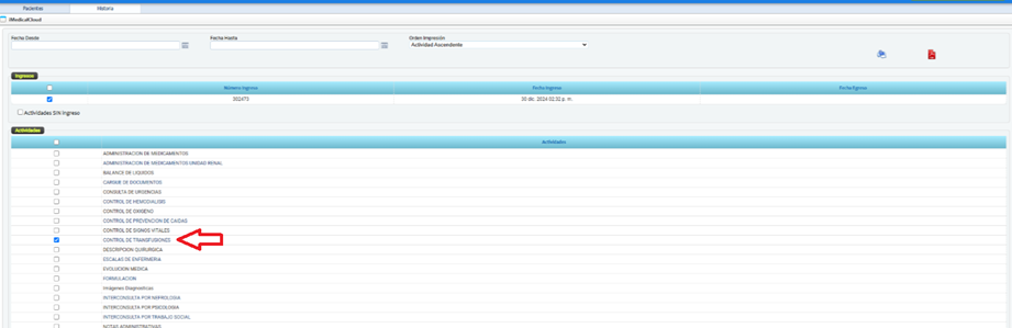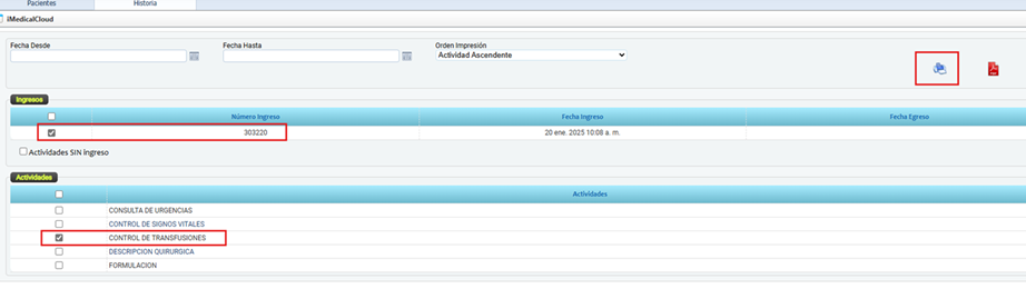 - La actividad CONTROL DE TRANSFUSIONES está marcada para impresión.