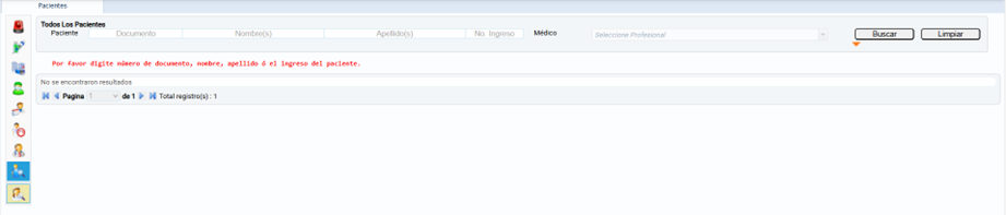 "Por favor digite número de documento, nombre, apellido o el ingreso del paciente."