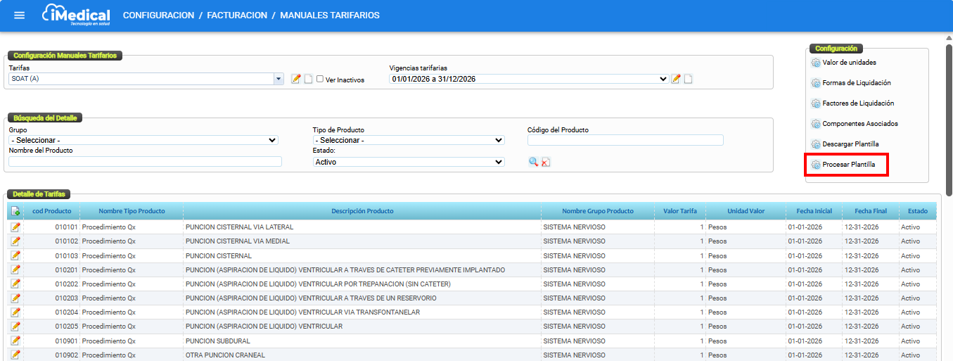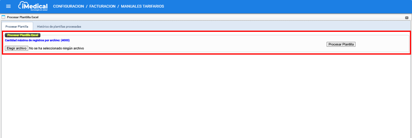 Posteriormente, desde el módulo de Manuales Tarifarios, se puede acceder a la opción Procesar Plantilla Excel, que permite subir nuevamente este archivo al sistema para aplicar los cambios.