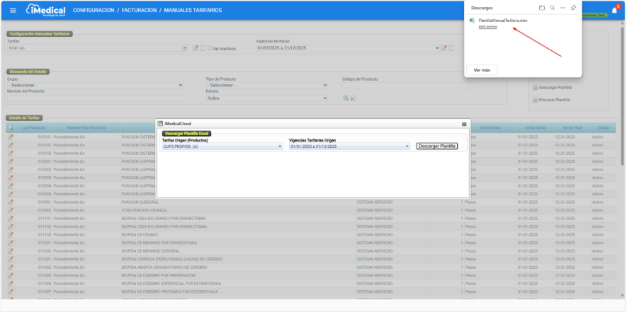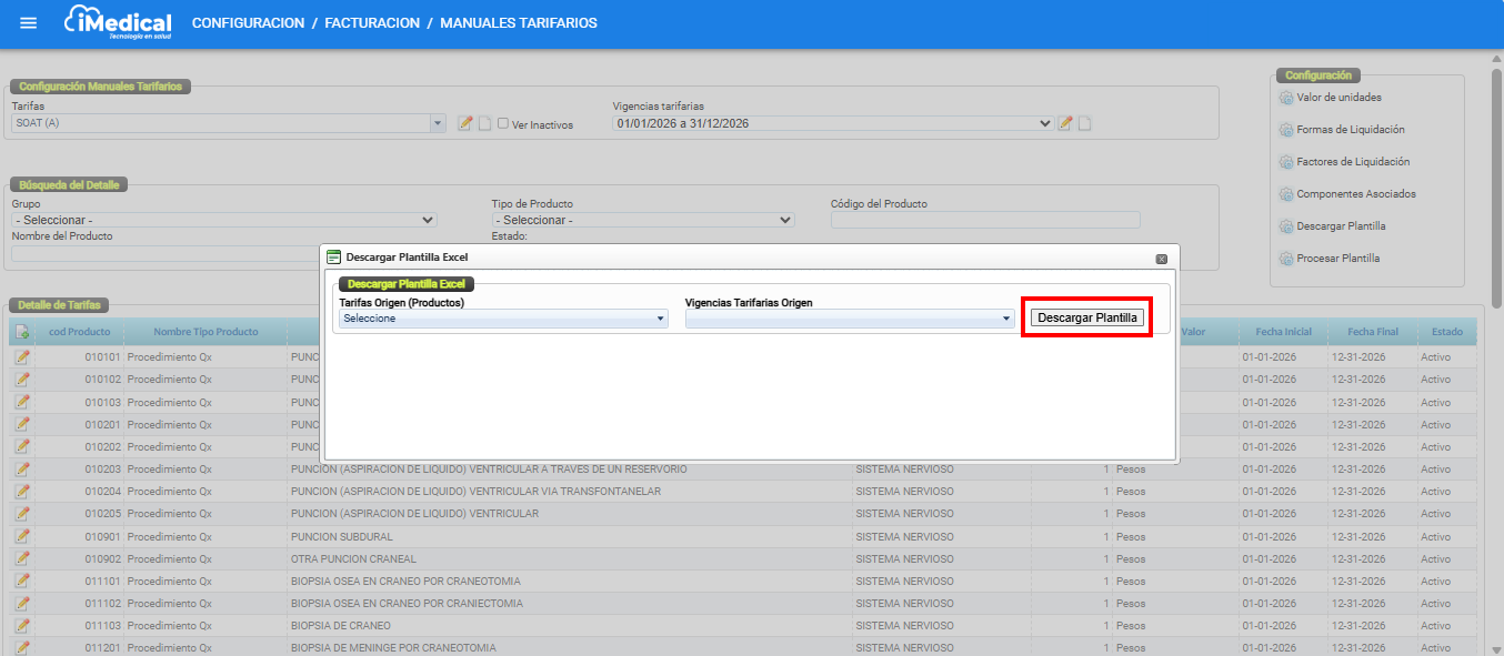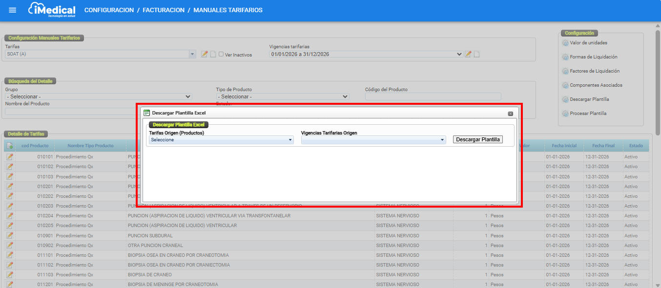 El presente manual ha sido elaborado con el propósito de orientar a los usuarios en el uso de las funcionalidades Descargar Plantilla y Procesar Plantilla Excel del módulo de Manuales Tarifarios del sistema iMedical. Estas herramientas permiten gestionar de forma masiva los productos y valores tarifarios mediante archivos en formato Excel, facilitando procesos de creación, actualización o migración de información tarifaria dentro del sistema.