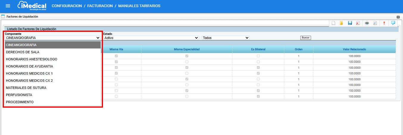 Aquí se selecciona el componente quirúrgico sobre el cual se desea aplicar o modificar los factores de liquidación. Entre los ejemplos disponibles están: