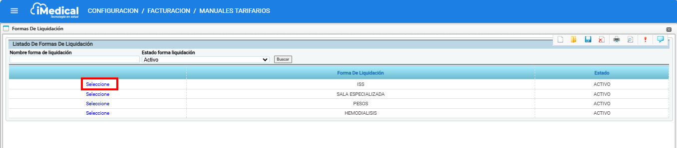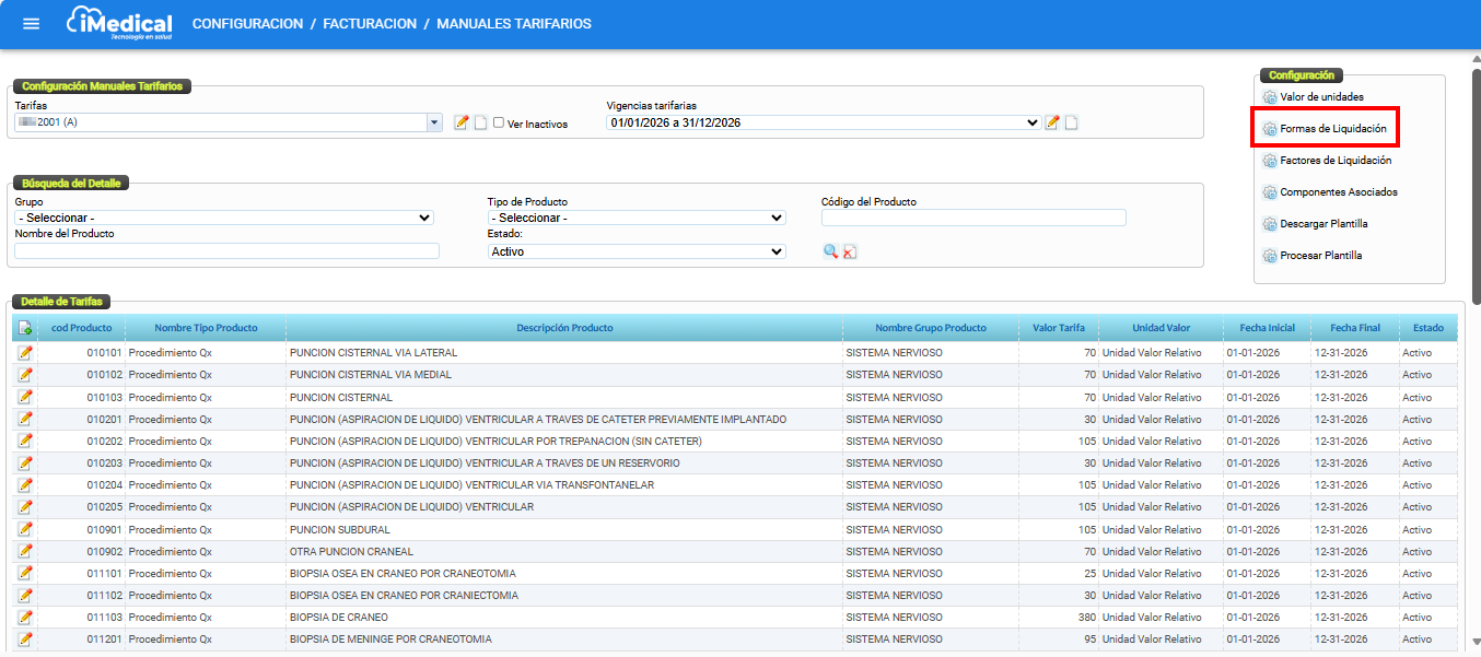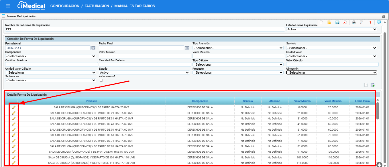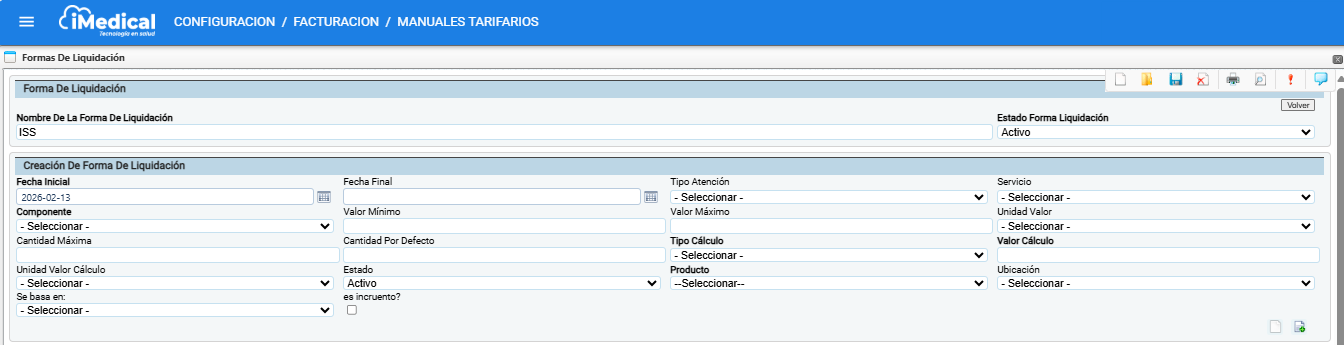 iMedical permite configurar diferentes formas de liquidación como parte del proceso de tarifación. Estas formas permiten establecer reglas y rangos para el cobro de ciertos servicios o componentes, especialmente útiles cuando se manejan escalas de cobro basadas en unidades de valor relativas (como UVR).