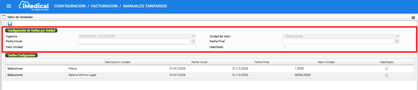 Esta pantalla permite registrar y administrar el valor de la unidad tarifaria para una vigencia determinada. Esta configuración es esencial para el cálculo de tarifas dentro de los manuales tarifarios del sistema.