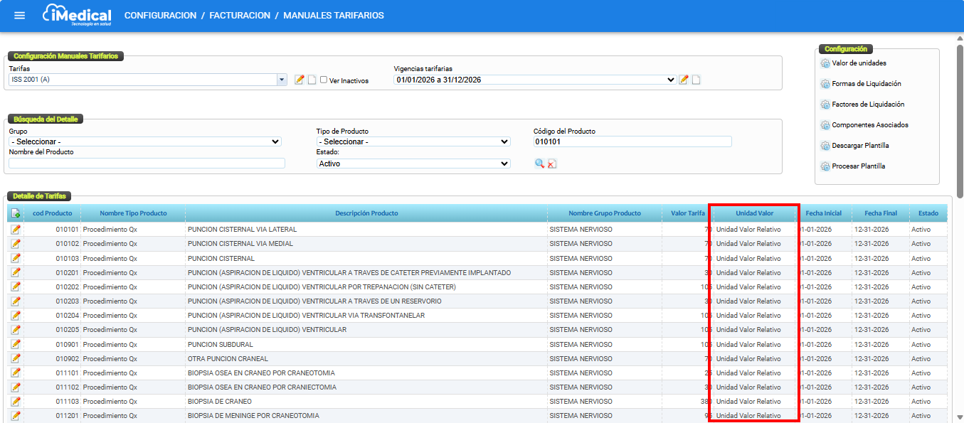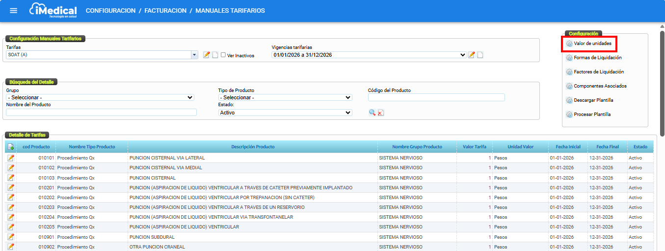 iMedical permite configurar diferentes unidades de valor, lo cual otorga flexibilidad al momento de definir tarifas para productos y procedimientos. Esta funcionalidad es esencial para soportar tanto cobros simples en moneda local (pesos colombianos) como esquemas de tarifas más complejas basadas en unidades de valor relativas.
