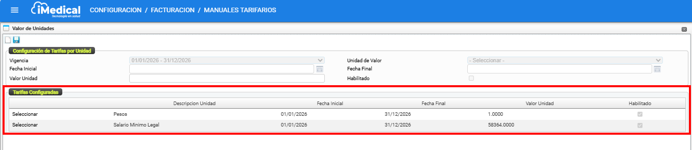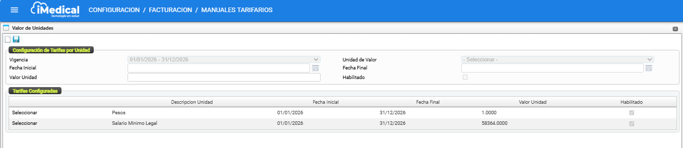 Configuración > Facturación > Manuales Tarifarios > Valor de unidades