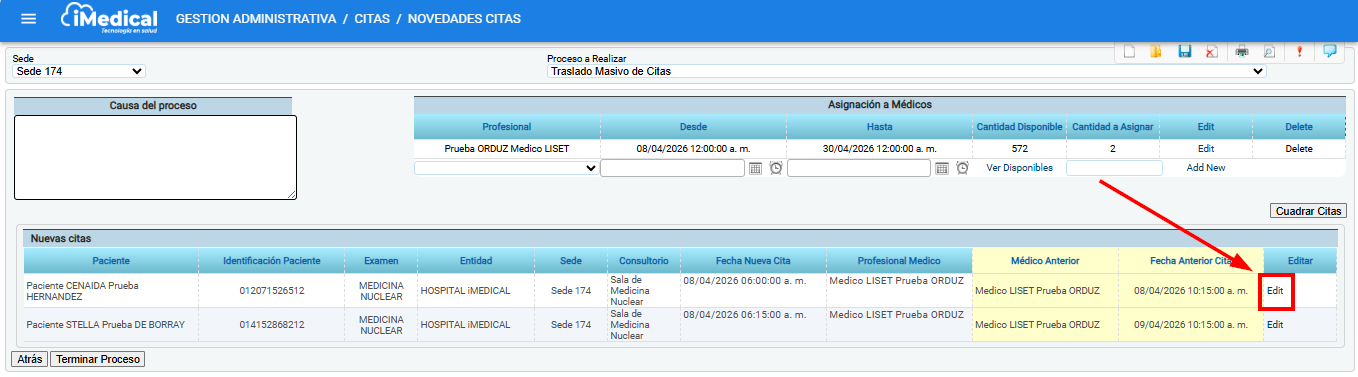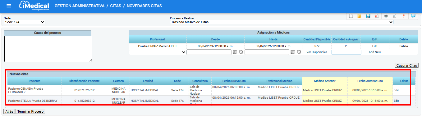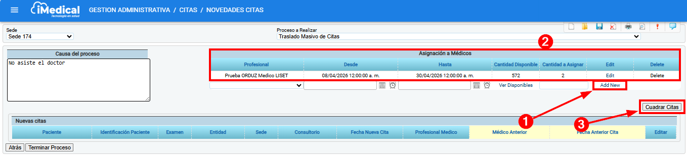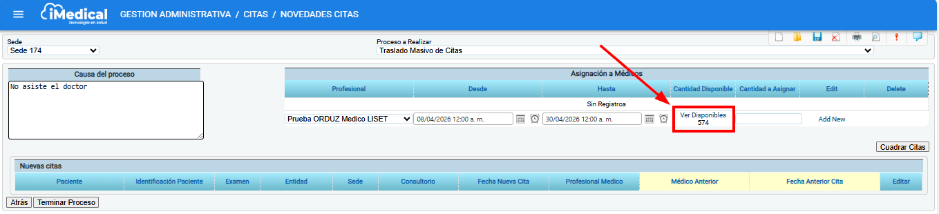 Al ya confirmar la cantidad de citas a trasladar (columna Cantidad a asignar) se debe dar clic en el botón Cuadrar citas