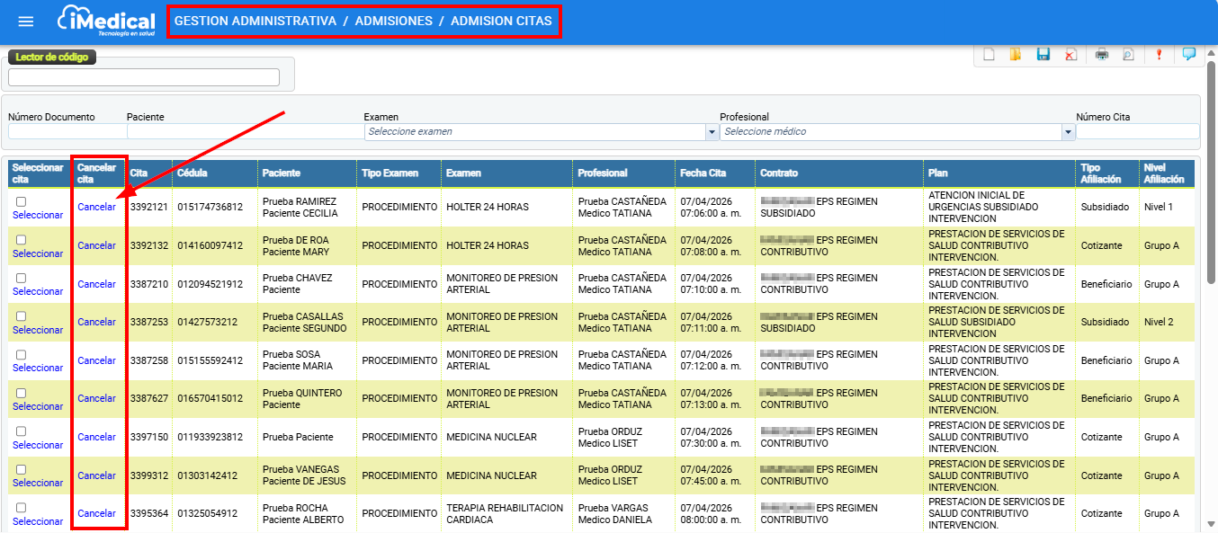 Por medio de la pantalla Admisión citas, pero aquí se debe tener en cuenta que solo se puede cancelar de a una cita para el mismo día que está programada, este proceso se hace mediante la columna Cancelar cita, botón cancelar.