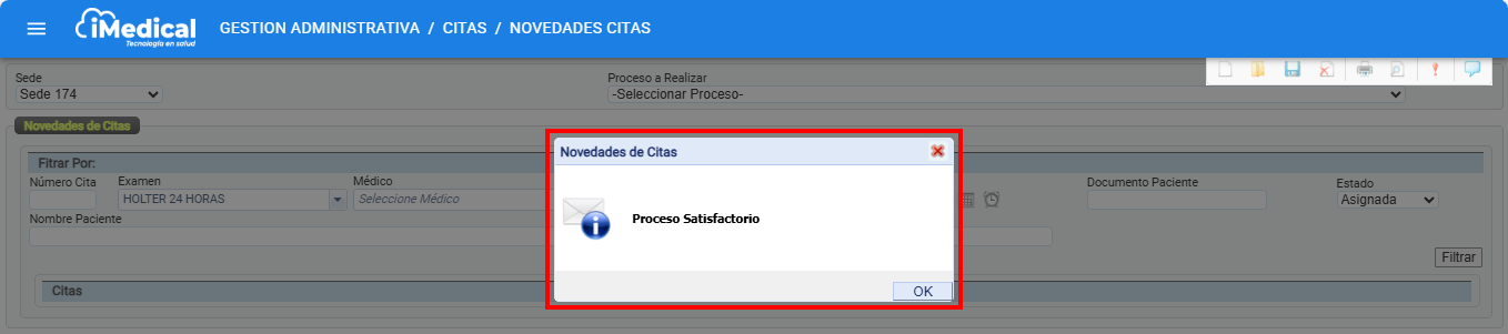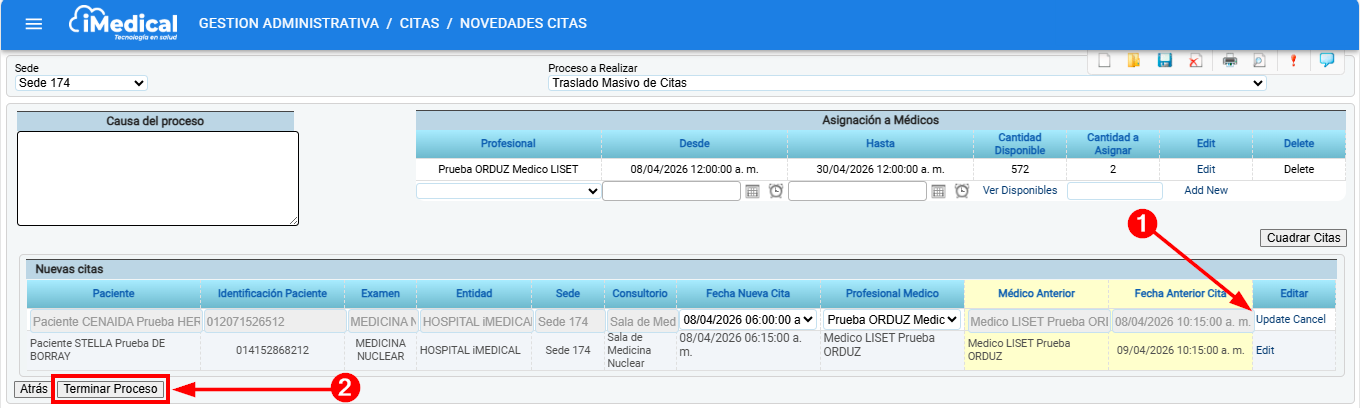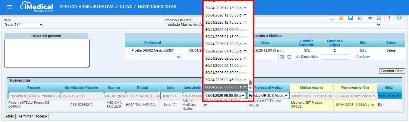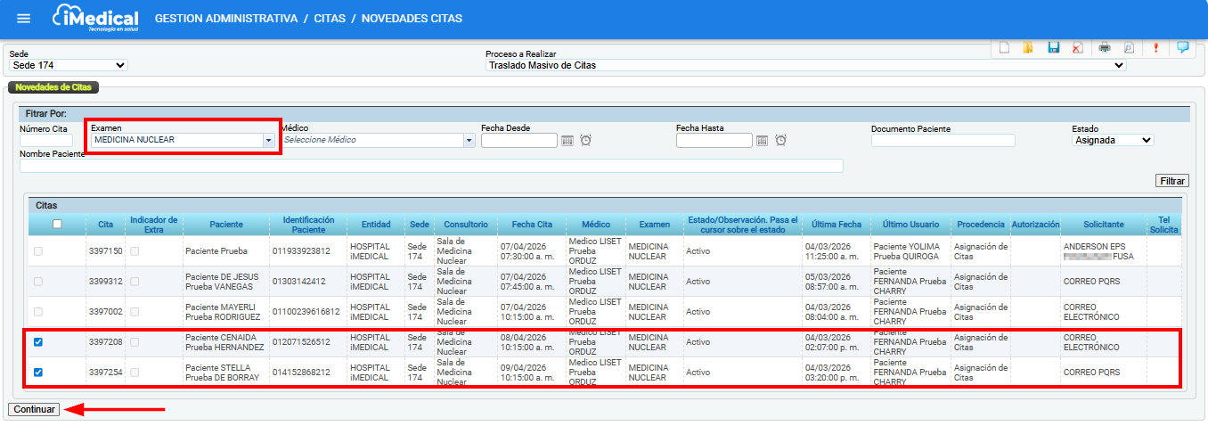 Para este proceso se debe tener en cuenta que, para poder trasladar las citas, estas deben pertenecer al mismo examen o sino el sistema no dejará trasladarla.