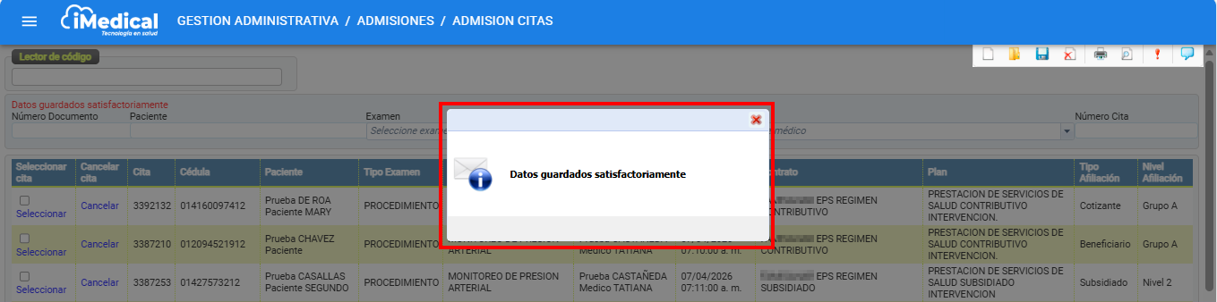 Luego de seleccionar la cita o citas a configurar, se debe dar clic en Guardar , para que el proceso sea exitoso.