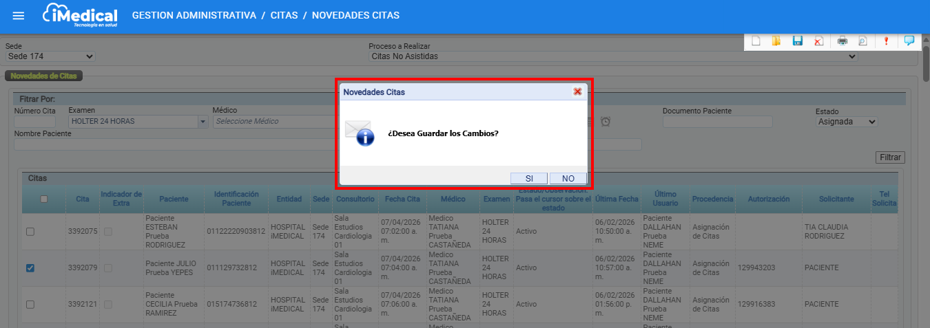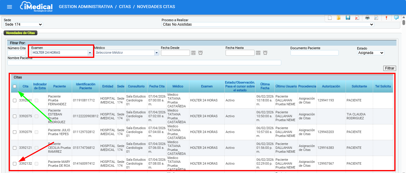 Al filtrar con alguno de los campos, el sistema trae las citas que cumplen con el criterio filtrado, se debe tener en cuenta que para este caso solo deja marcar las citas que ya hayan cumplido su fecha y no fueron asistidas.