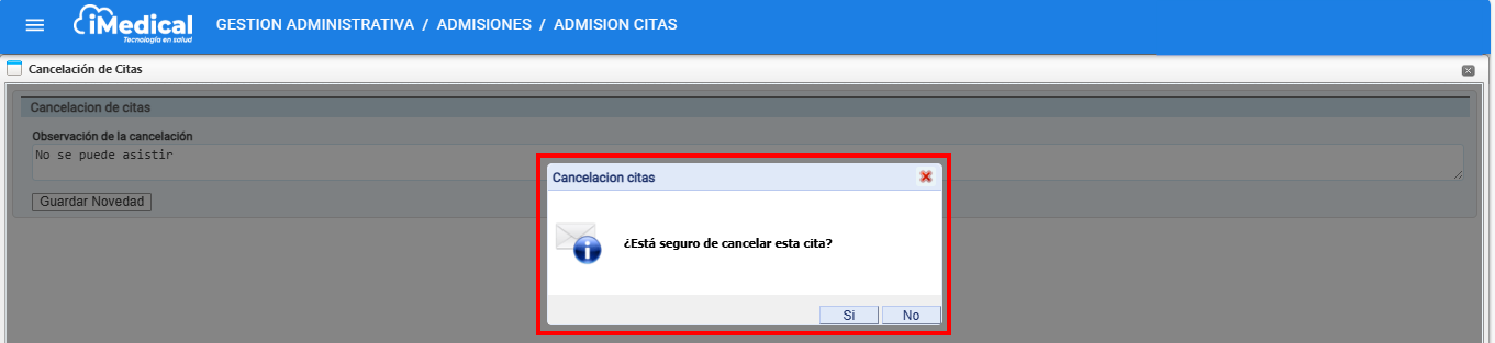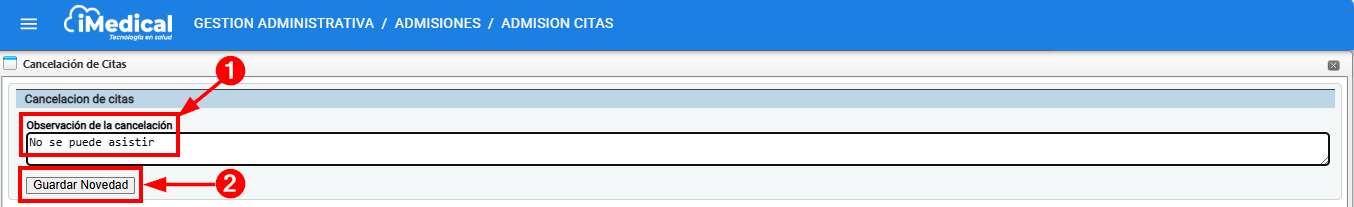 Se abre una ventana donde se debe escribir una observación de la cancelación de la cita y se hace clic en el botón Guardar Novedad