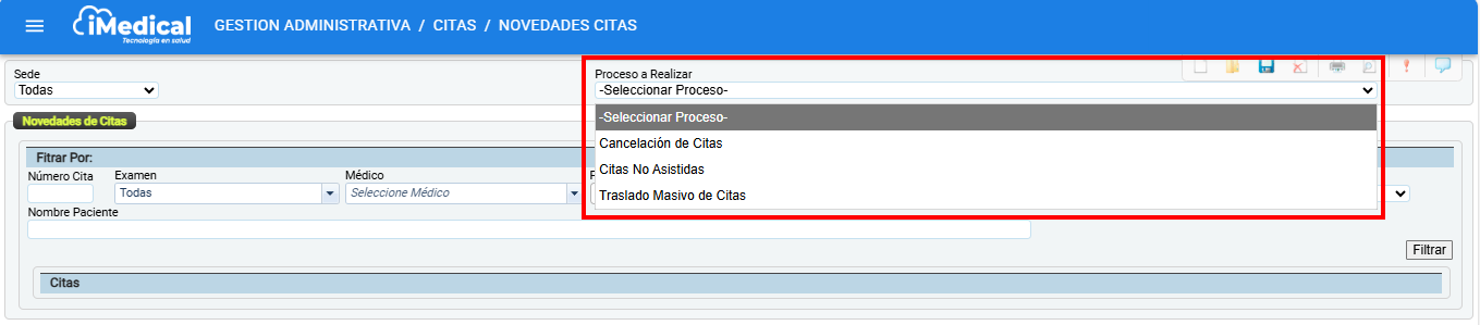 El manual describe los pasos necesarios para acceder a la funcionalidad y realizar cada tipo de novedad disponible dentro del sistema. Incluye las instrucciones para seleccionar el proceso correspondiente desde la interfaz principal—cancelación de citas, marcación de citas no asistidas o traslado masivo de citas— asegurando una gestión adecuada y oportuna. No abarca procesos de creación de agendas ni de programación inicial de citas.