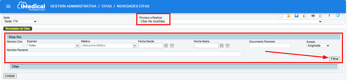 Al seleccionar el proceso Citas no Asistidas, muestra la siguiente pantalla. En esta se pueden usar varios filtros para encontrar la cita o citas requeridas a configurar.