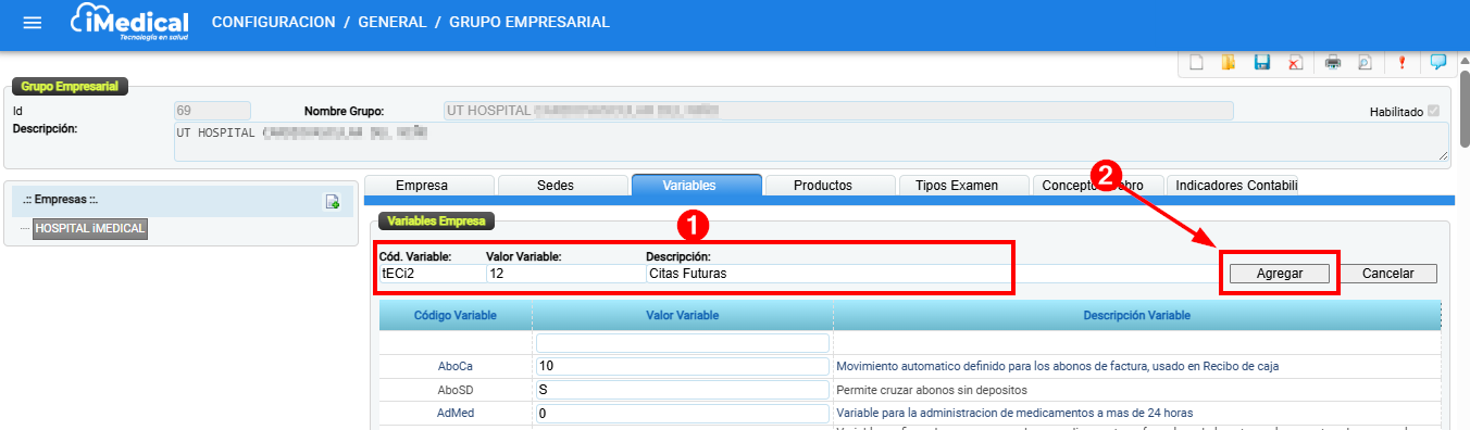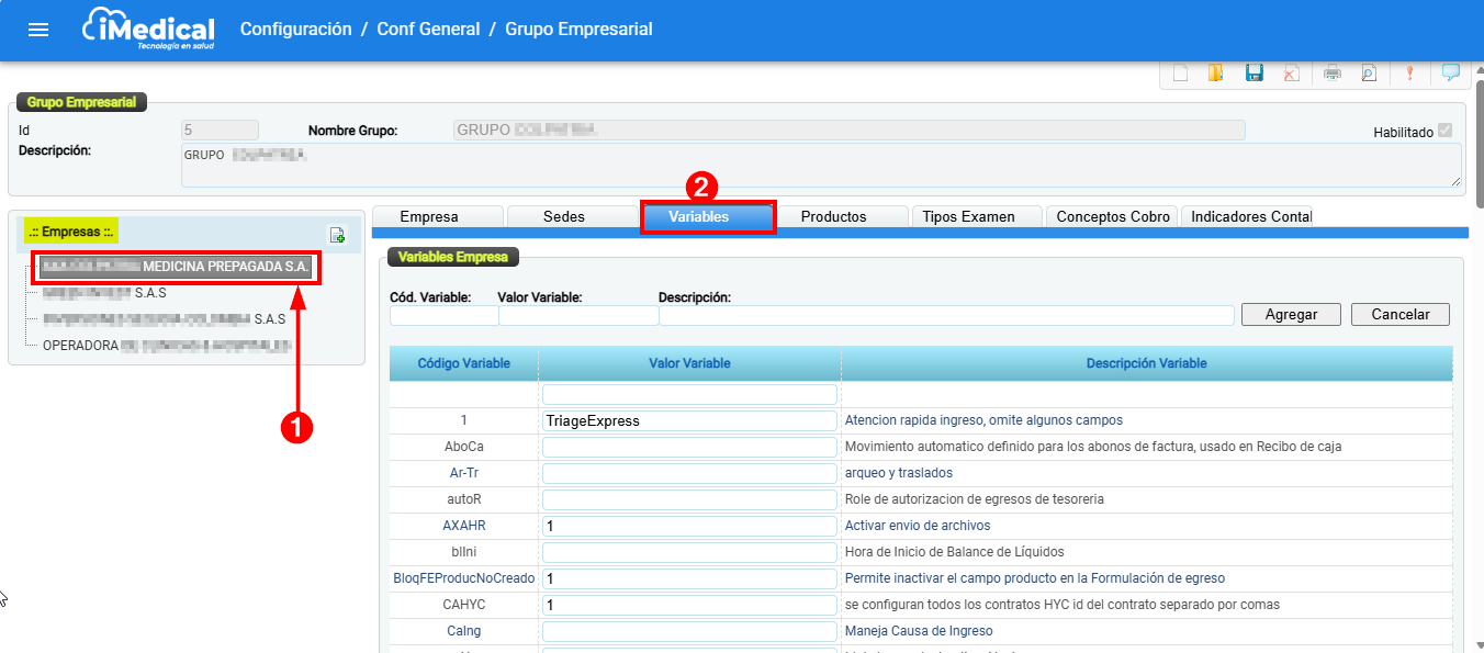 Una vez seleccionada la entidad en la columna "Empresas", se debe ingresar a la pestaña "Variables"