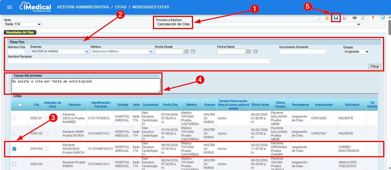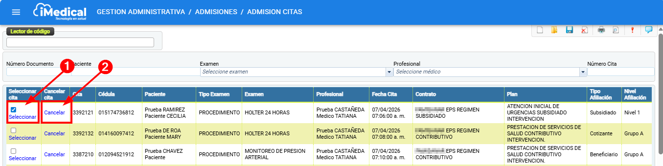 Se selecciona la cita que se desea cancelar marcando la casilla de verificación, luego se hace clic sobre la opción "Cancelar".