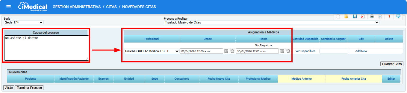 Esto hablita los campos "Fecha nueva cita" y "Profesional Médico" para poder realizar los ajustes que sean necesarios
