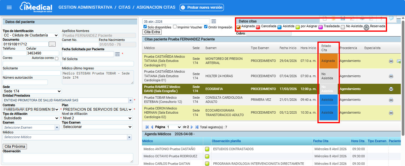 Al diligenciar los datos, en el siguiente panel se puede verificar por color, el estado de la cita que fue configurada.