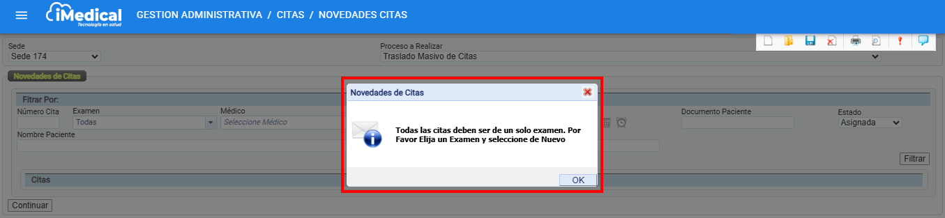 EJEMPLO: Al seleccionar las citas a trasladar y darle al botón de continuar , el sistema genera una alerta que indica que debe seleccionar citas que tengan el mismo examen: