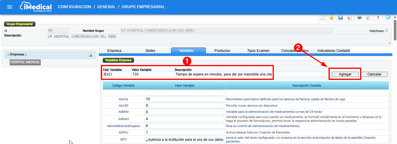 Variable "TEsCi", Define el tiempo de espera para que el sistema considere una cita como no asistida. El valor se registra en minutos.