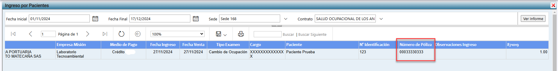 - Número de Póliza: Muestra el número de póliza asociado al ingreso (dato registrado en admisiones).