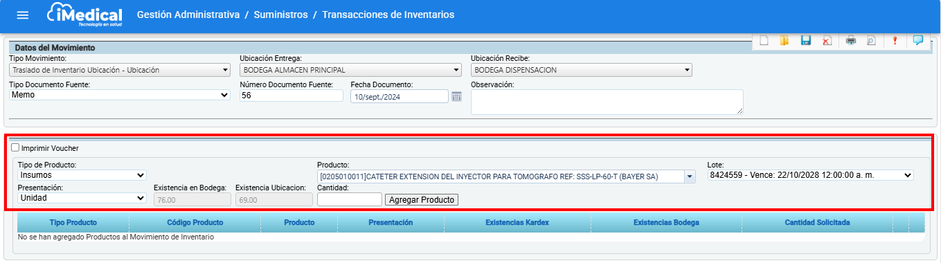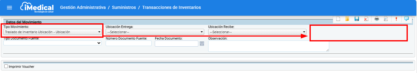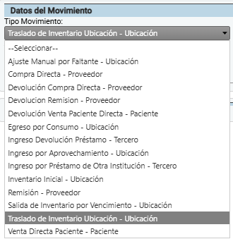 - Tipo Movimiento: Campo desplegable para seleccionar el tipo de movimiento. Para este ejemplo se utilizó el movimiento Traslado de Inventario Ubicación.