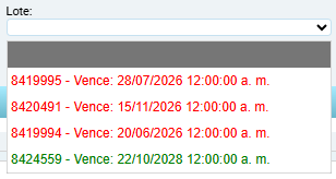 - Lote: Lista desplegable que permite seleccionar el lote disponible del producto elegido. Generalmente incluye información complementaria como número de lote y fecha de vencimiento, lo que permite garantizar trazabilidad y control de fechas. Los lotes vigentes aparecen de color verde, los lotes vencidos aparecen en color rojo.