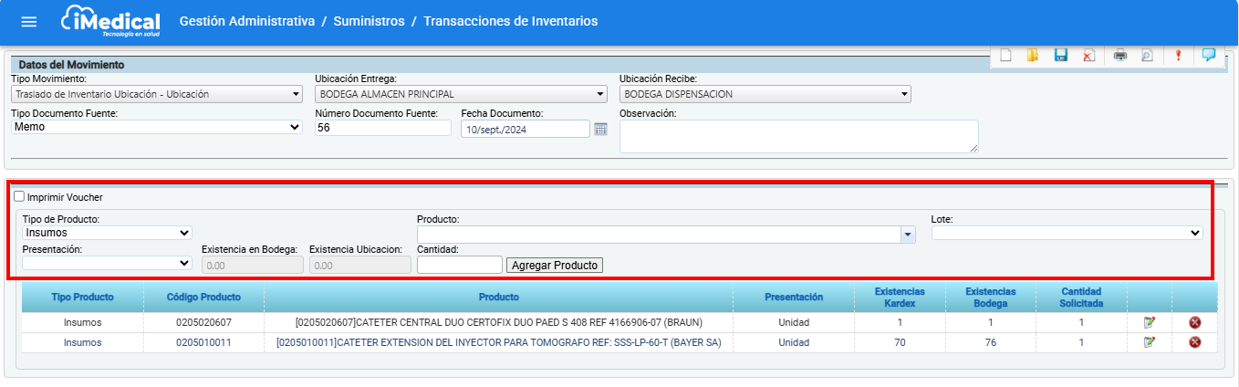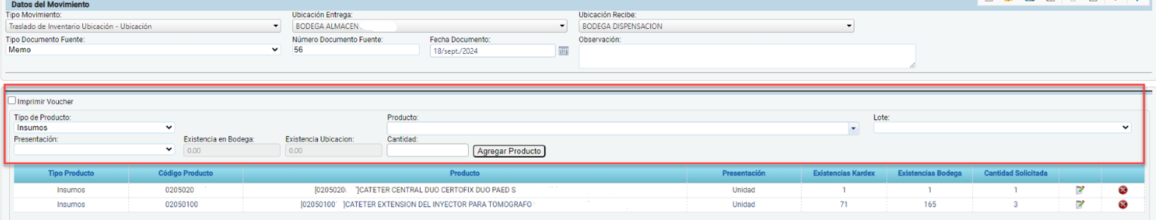 - Existencia en Bodega y Existencia Ubicación: Campos informativos que muestran la cantidad disponible en la bodega y en la ubicación específica. No son editables.