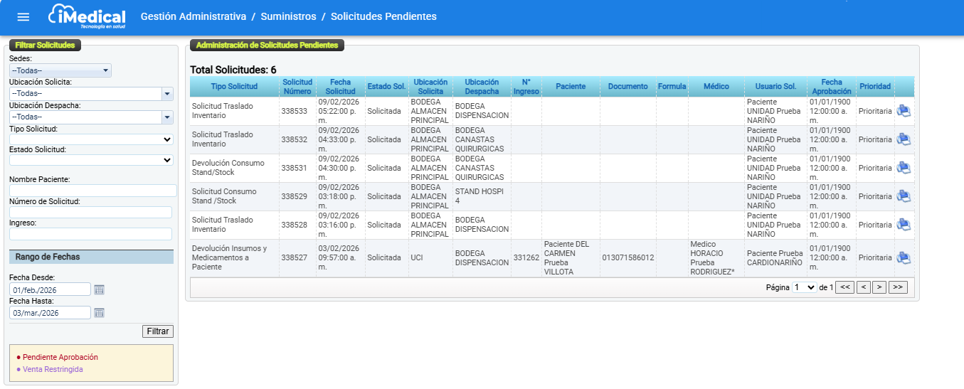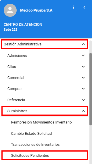 Ruta: Gestión Administrativa > Suministros > Solicitudes Pendientes