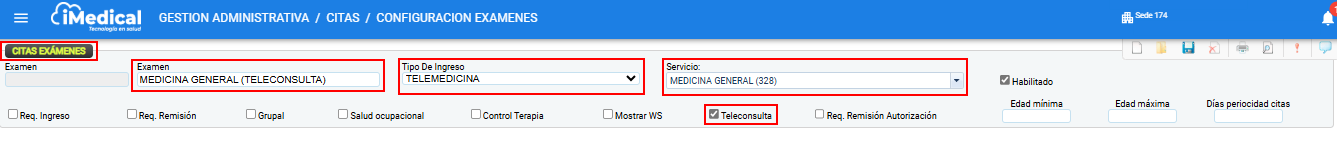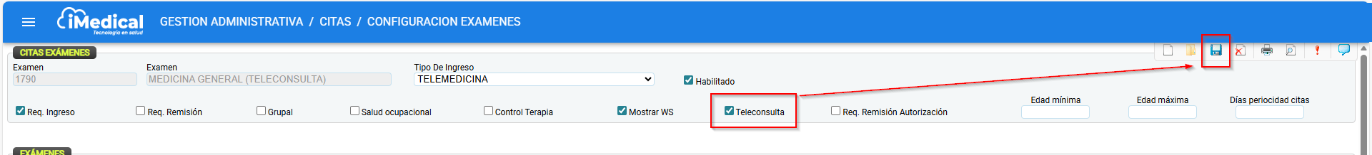 Como parte del proceso de citas es necesario habilitar las citas en modo teleconsulta en la Ruta: Gestión administrativa > Citas > Configuración de exámenes