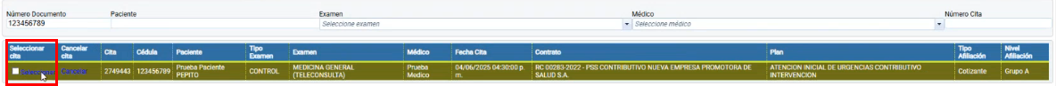 Al realizar la búsqueda, nos aparece los datos del paciente, hacemos clic en el cuadro de selección o check box Seleccionar