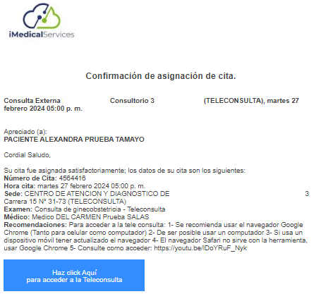 Al asignar la cita al paciente el sistema de Información envía al correo electrónico registrado acceso a la cita.