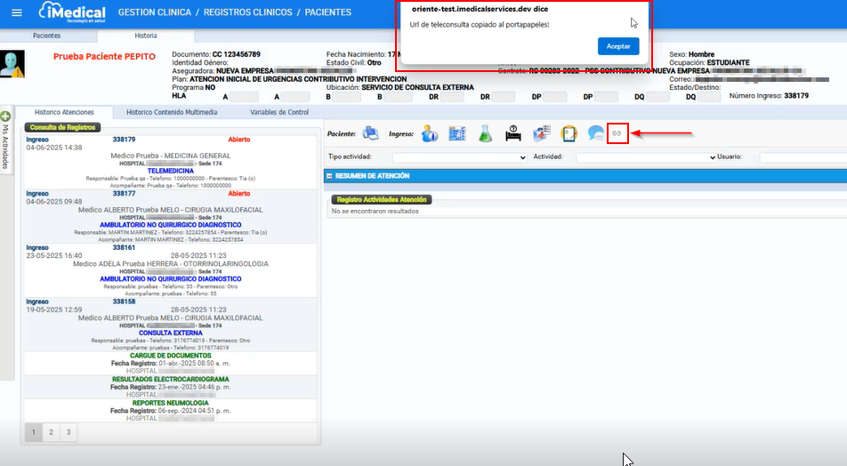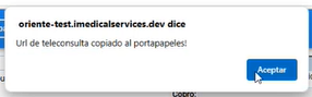 Nos aparece el mensaje: Url de teleconsulta copiado al portapapeles! Y queda disponible para compartirlo.