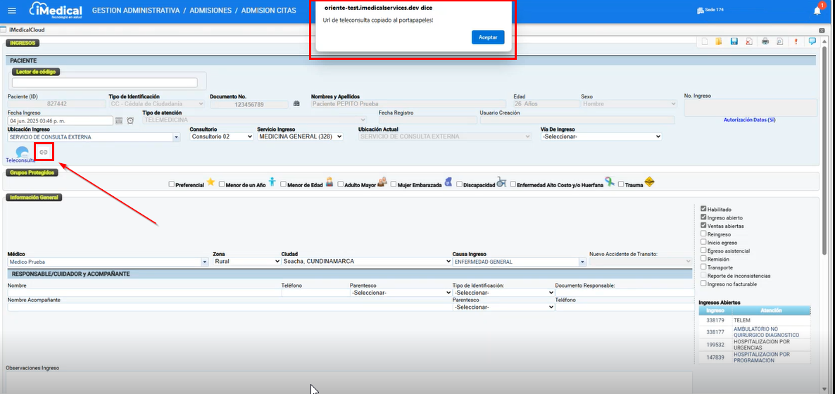 En la siguiente pantalla nos aparece los datos de ingreso y encontraremos el botón del link de la teleconsulta, al hacer clic sobre este, aparece el respectivo mensaje, en este mensaje debemos dar clic en Aceptar y la url quedará copiada y lista para compartir.