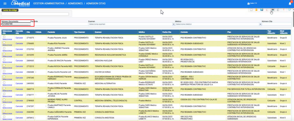 Estando en la interfaz de Pacientes, vamos a pacientes citas y hacemos clic sobre su icono, realizamos la búsqueda del paciente que tiene programada una teleconsulta mediante su documento de identidad.
