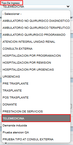 Campo desplegable Tipo de Ingreso: TELEMEDICINA