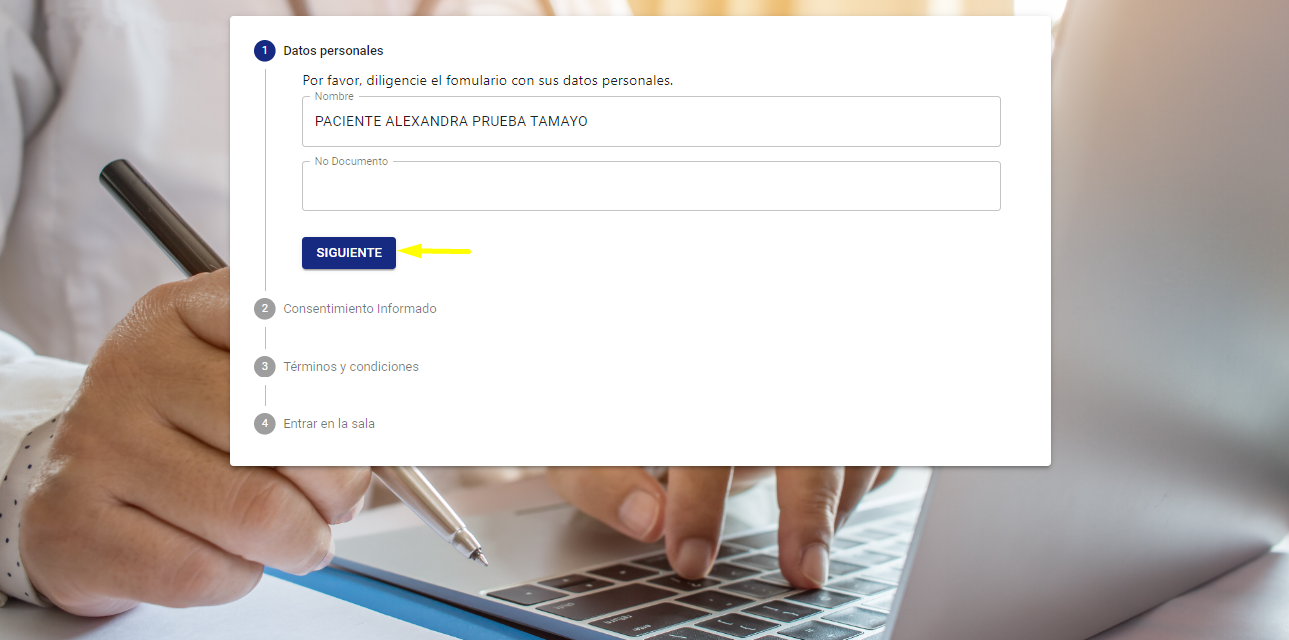 En esta pantalla iniciamos introduciendo el número de documento del paciente que tiene asignada una teleconsulta.
