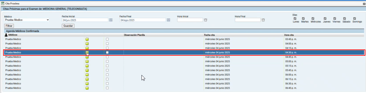 Luego nos aparece la pantalla de las próximas citas disponibles. Seleccionamos la cita programada en los pasos anteriores
