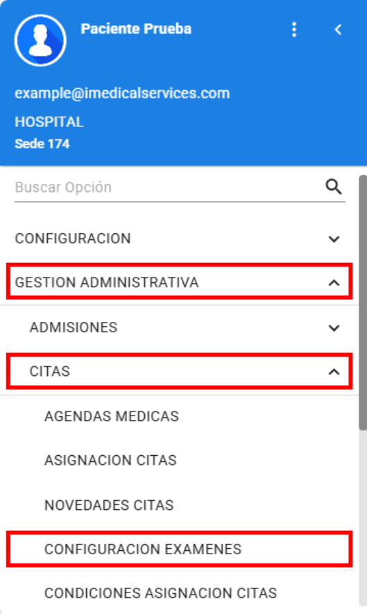 Para tener acceso a esta funcionalidad, es necesario realizar una configuración previa, para esto nos dirigimos a la siguiente Ruta: Gestión Administrativa > Citas > Configuración de Exámenes