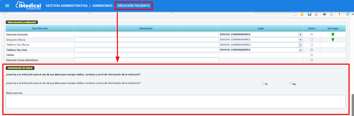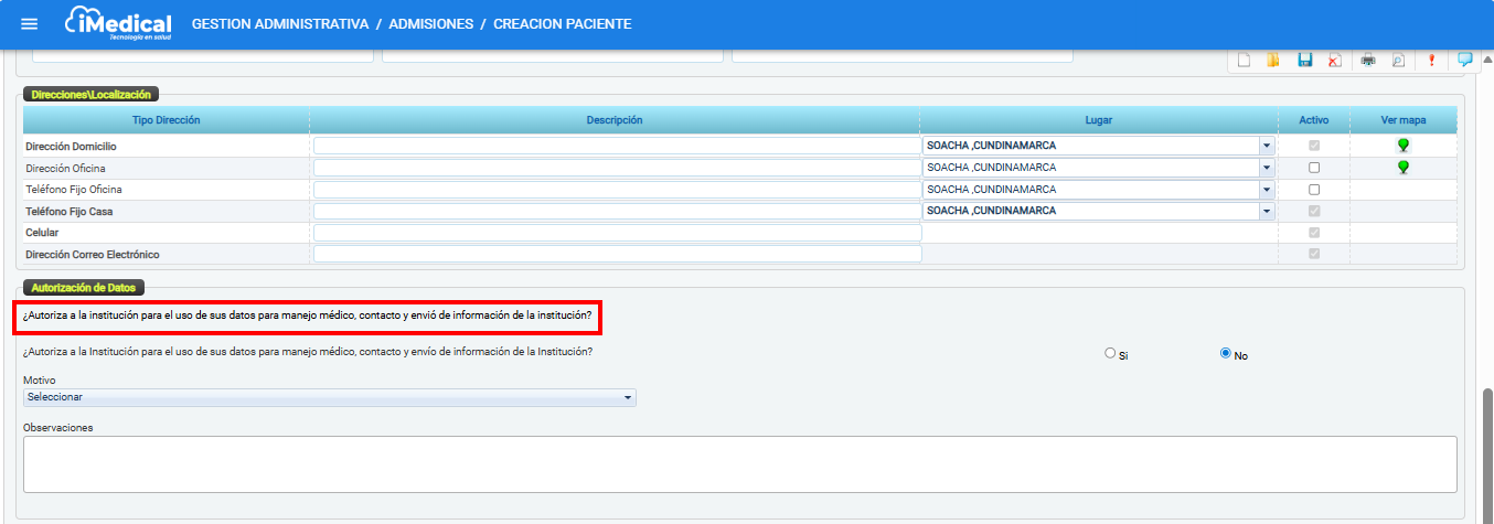Los datos del formulario Autorización de datos se podrán modificar desde ingreso o creación de paciente.