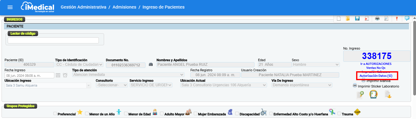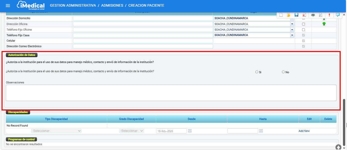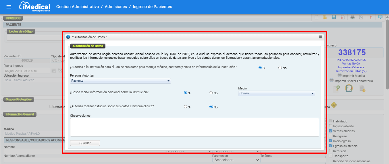 Ingreso Directo al Paciente: Si el ingreso del paciente se está generando sin tener una cita previamente asignada, pero el paciente no tiene diligenciado el formulario de Autorización de Datos, iMedical permitirá crear el ingreso sin problemas.