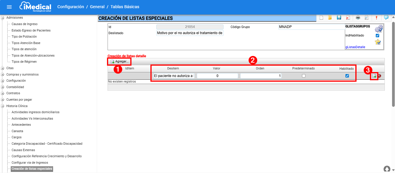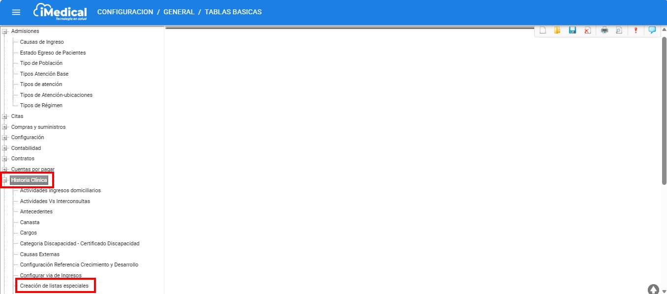 En la lista jerárquica expandible, ubicarse sobre la carpeta "Historia clínica" y seguidamente en la opción "Creación de listas especiales".