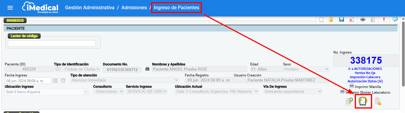 En el campo "No. Ingreso", digite el número del ingreso del paciente.