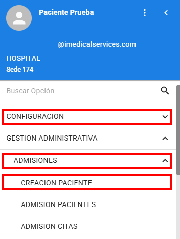 Siguiendo la Ruta: Gestión Administrativa > Admisiones > Creación Paciente