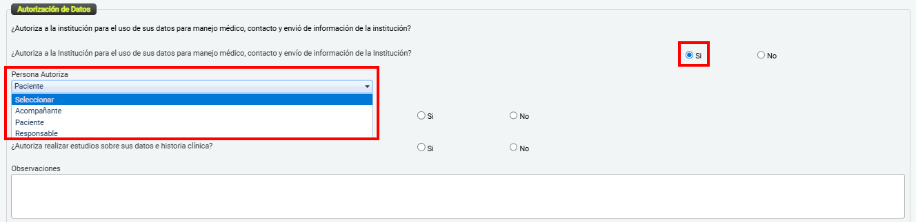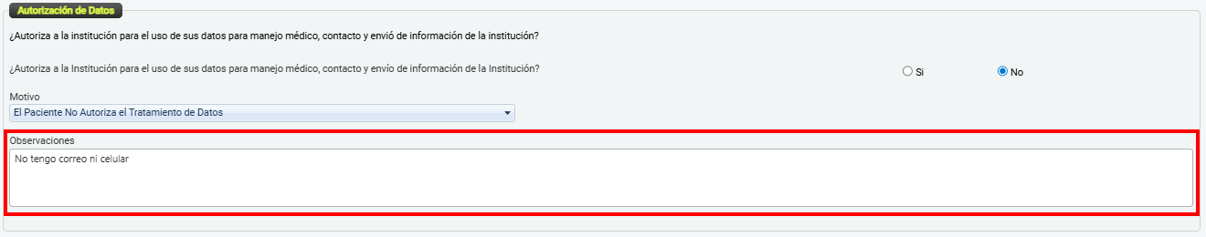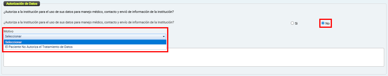 Si la opción seleccionada es "No", se habilita otro campo desplegable "Motivo", con la única opción: "El Paciente No Autoriza el Tratamiento de Datos"