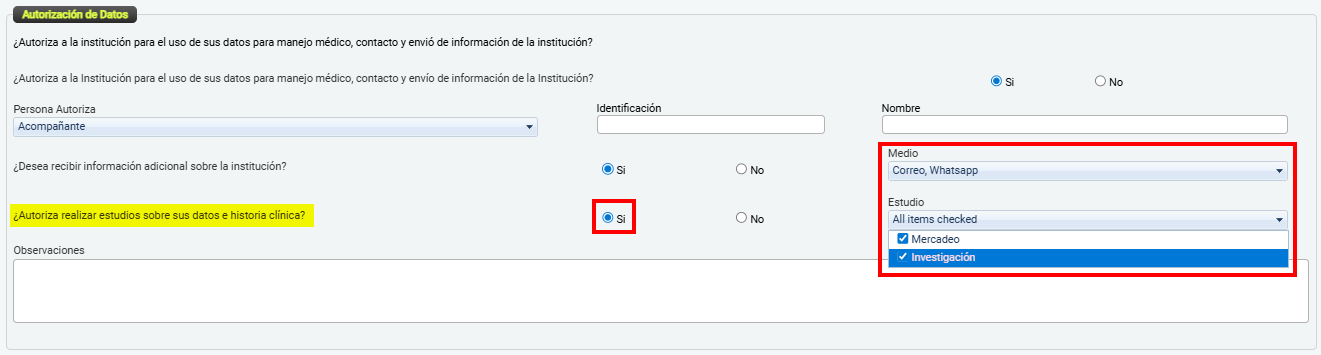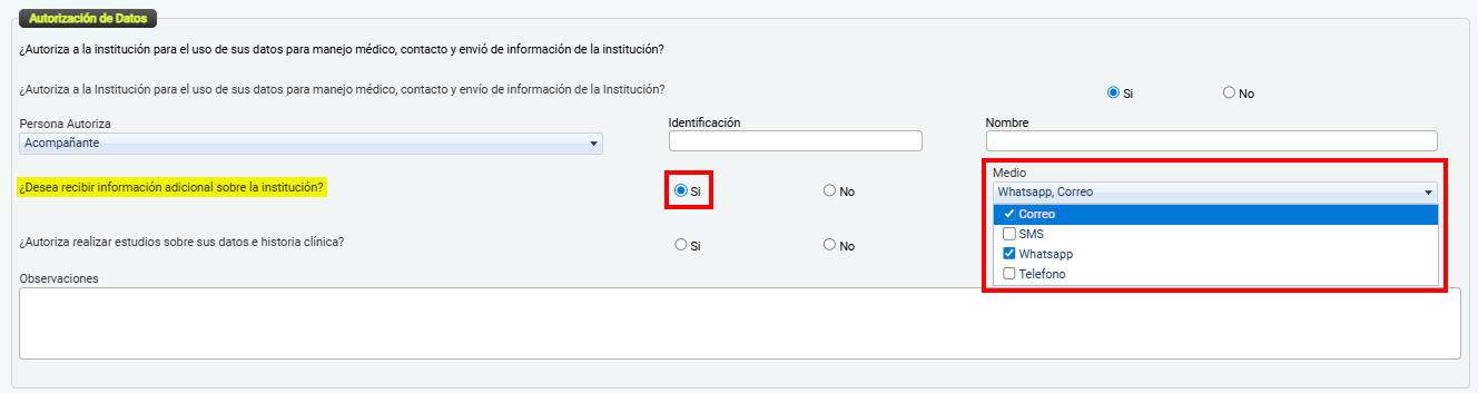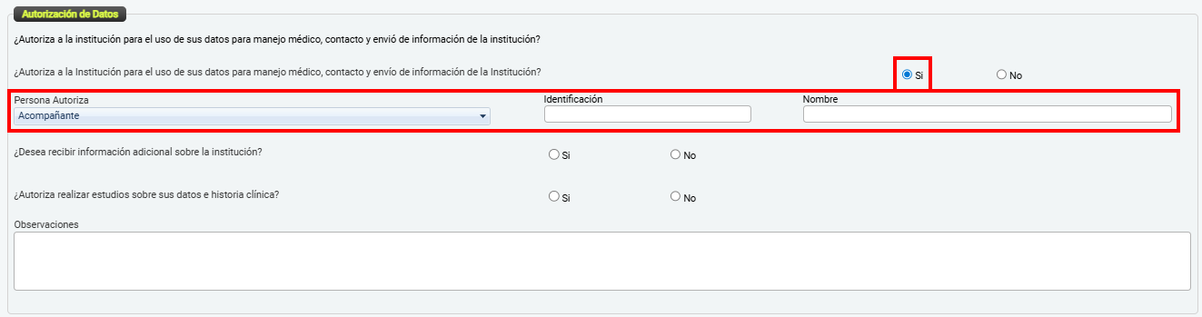 Volviendo a la primera pregunta "¿Autoriza a la institución para el uso de sus datos para manejo médico, contacto y envío de información de la institución?"