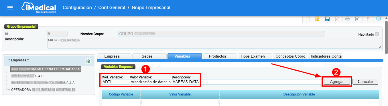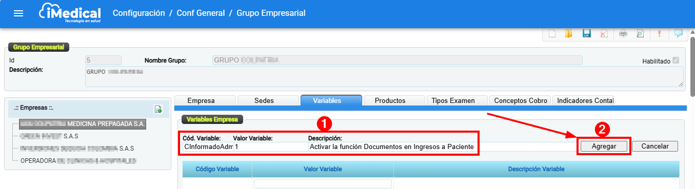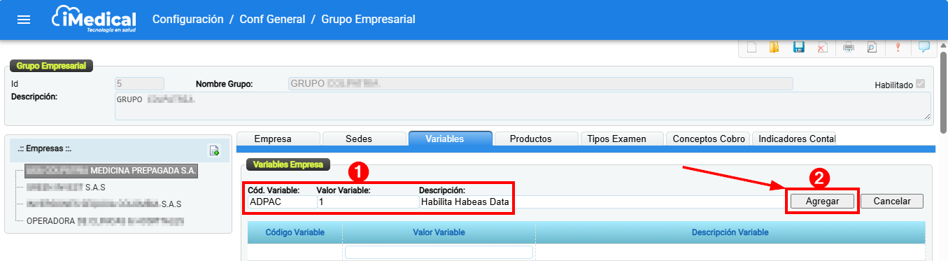 En la columna de la izquierda de nombre "Empresas", se debe seleccionar la entidad, esto hará que aparezcan nuevas pestañas; se debe seleccionar la pestaña "Variables"