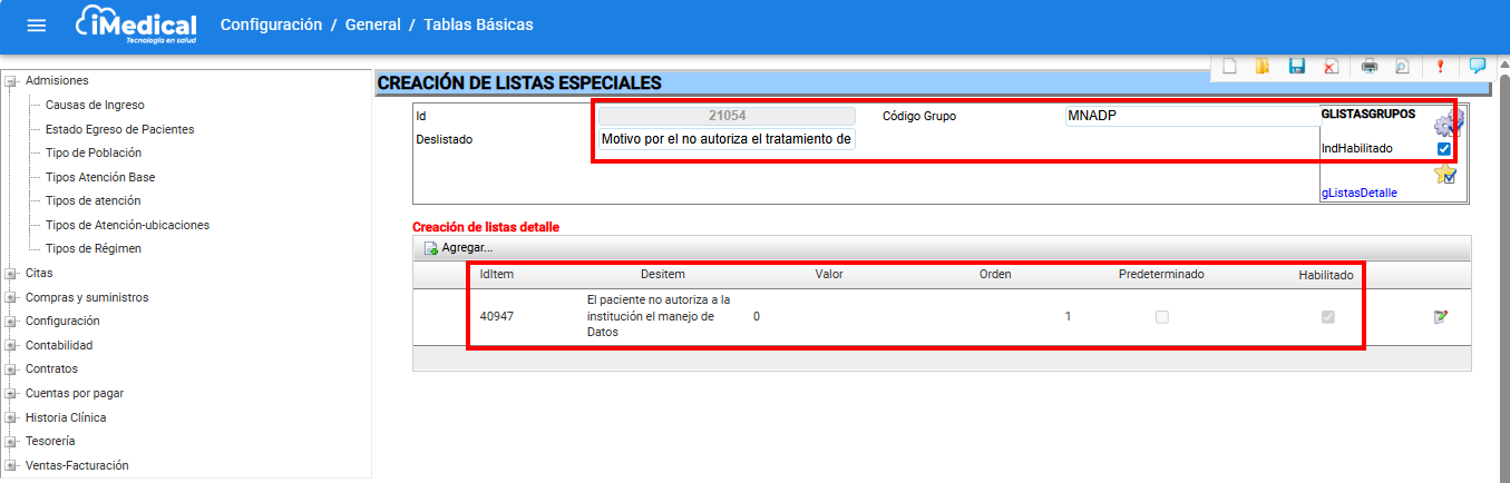 MNADP: En ella se podrá configurar los diferentes motivos por los cuales un paciente, acudiente o responsable no Autoriza el manejo de los Datos. Piner la siguiente información: