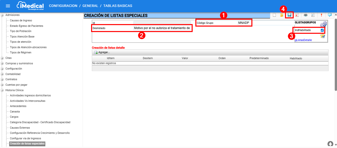 Luego se debe hacer clic sobre el ícono "Agregar" , esto habilitará los campos en la sección "Creación de listas detalle", deben ser diligenciados de la siguiente manera: